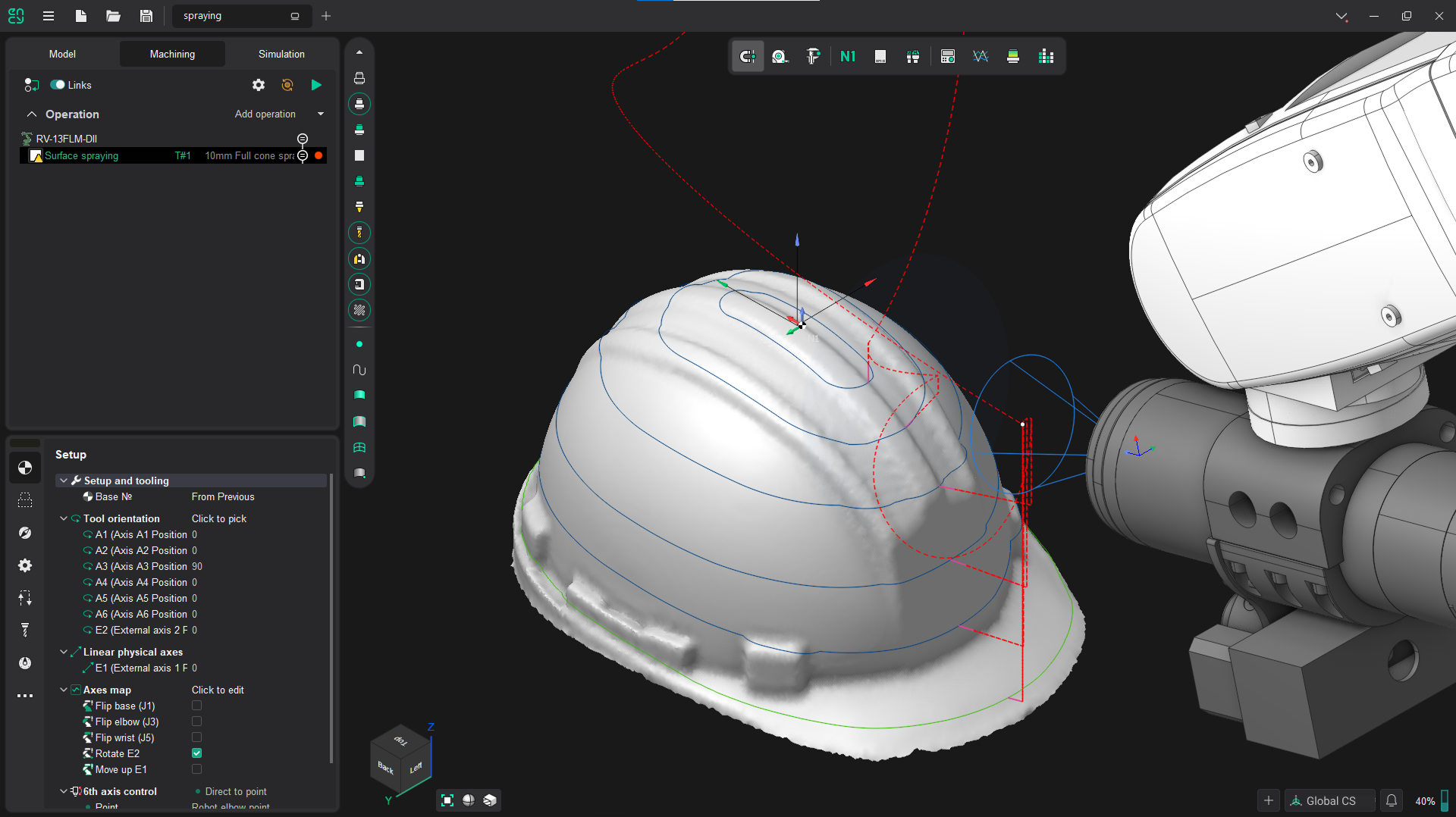The machine axis orientation is controlled by the simplified surface, while the tool itself moves along the original STL model.